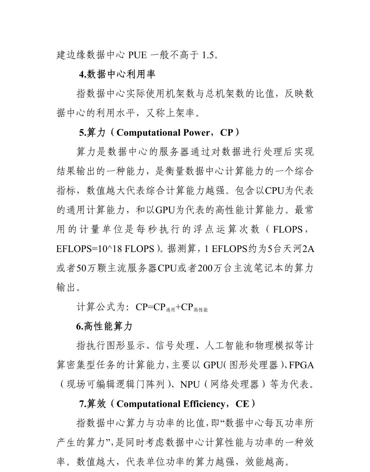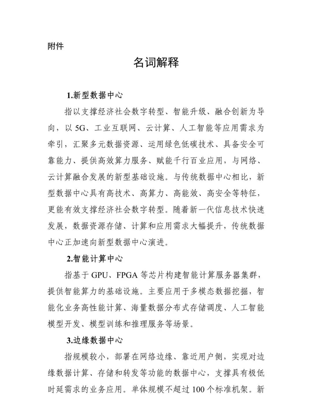 新型數(shù)據(jù)中心發(fā)展三年行動(dòng)計(jì)劃 新型數(shù)據(jù)中心是以支撐經(jīng)濟(jì)社會(huì)數(shù)字轉(zhuǎn)型、智能升級(jí)、融合創(chuàng)新為導(dǎo)向,以5G、工業(yè)互聯(lián)網(wǎng)、云計(jì)算、人工智能等應(yīng)用需求為牽引,匯聚多元數(shù)據(jù)資源、運(yùn)用綠色低碳技術(shù)、具備安全可靠能力、提供高效算力服務(wù)、賦能千行百業(yè)應(yīng)用的新型基礎(chǔ)設(shè)施,具有高技術(shù)、高算力、高能效、高安全特征。隨著新一代信息技術(shù)快速發(fā)展,數(shù)據(jù)資源存儲(chǔ)、計(jì)算和應(yīng)用需求大幅提升,傳統(tǒng)數(shù)據(jù)中心正加速與網(wǎng)絡(luò)、云計(jì)算融合發(fā)展,加快向新型數(shù)據(jù)中心演進(jìn)。為統(tǒng)籌推進(jìn)新型數(shù)據(jù)中心發(fā)展,構(gòu)建以新型數(shù)據(jù)中心為核心的智能算力生態(tài)體系,發(fā)揮對(duì)數(shù)字經(jīng)濟(jì)的賦能和驅(qū)動(dòng)作用,制定本行動(dòng)計(jì)劃。 以習(xí)近平新時(shí)代中國(guó)特色社會(huì)主義思想為指導(dǎo),全面貫徹黨的十九大和十九屆二中、三中、四中、五中全會(huì)精神,把握新發(fā)展階段、貫徹新發(fā)展理念、構(gòu)建新發(fā)展格局,以賦能數(shù)字經(jīng)濟(jì)發(fā)展為目標(biāo),推動(dòng)新型數(shù)據(jù)中心建設(shè)布局優(yōu)化、網(wǎng)絡(luò)質(zhì)量提升、算力賦能加速、產(chǎn)業(yè)鏈穩(wěn)固增強(qiáng)、綠色低碳發(fā)展、安全保障提高,打造新型智能算力生態(tài)體系,有效支撐各領(lǐng)域數(shù)字化轉(zhuǎn)型,為經(jīng)濟(jì)社會(huì)高質(zhì)量發(fā)展提供新動(dòng)能。 統(tǒng)籌協(xié)調(diào),均衡有序。堅(jiān)持系統(tǒng)觀念,統(tǒng)籌存量和增量,加強(qiáng)數(shù)據(jù)中心規(guī)劃協(xié)調(diào),避免低質(zhì)量、粗放型建設(shè)發(fā)展。提升數(shù)據(jù)中心整體利用率,實(shí)現(xiàn)全國(guó)數(shù)據(jù)中心科學(xué)布局、有序發(fā)展。 需求牽引,深化協(xié)同。堅(jiān)持市場(chǎng)需求導(dǎo)向,建用并舉。推動(dòng)新型數(shù)據(jù)中心與網(wǎng)絡(luò)協(xié)同建設(shè),推進(jìn)新型數(shù)據(jù)中心集群與邊緣數(shù)據(jù)中心協(xié)同聯(lián)動(dòng),促進(jìn)算力資源協(xié)同利用,加強(qiáng)國(guó)際國(guó)內(nèi)數(shù)據(jù)中心協(xié)同發(fā)展。 分類引導(dǎo),互促互補(bǔ)。堅(jiān)持多元主體共建原則,鼓勵(lì)不同主體在新型數(shù)據(jù)中心建設(shè)運(yùn)營(yíng)中發(fā)揮各自優(yōu)勢(shì),推動(dòng)基礎(chǔ)電信企業(yè)強(qiáng)化網(wǎng)絡(luò)等基礎(chǔ)設(shè)施建設(shè),引導(dǎo)第三方數(shù)據(jù)中心企業(yè)提供差異化、特色化服務(wù),支持互聯(lián)網(wǎng)企業(yè)創(chuàng)新行業(yè)應(yīng)用。 創(chuàng)新驅(qū)動(dòng),產(chǎn)業(yè)升級(jí)。堅(jiān)持產(chǎn)業(yè)基礎(chǔ)高級(jí)化和產(chǎn)業(yè)鏈現(xiàn)代化,加強(qiáng)新型數(shù)據(jù)中心核心技術(shù)研發(fā),推動(dòng)產(chǎn)業(yè)鏈協(xié)同創(chuàng)新,育龍頭、筑基礎(chǔ)、強(qiáng)集群,促進(jìn)產(chǎn)業(yè)發(fā)展水平和服務(wù)能力不斷提升。 綠色低碳,安全可靠。堅(jiān)持綠色發(fā)展理念,支持綠色技術(shù)、綠色產(chǎn)品、清潔能源的應(yīng)用,全面提高新型數(shù)據(jù)中心能源利用效率。統(tǒng)籌發(fā)展與安全,進(jìn)一步強(qiáng)化網(wǎng)絡(luò)和數(shù)據(jù)安全管理和能力建設(shè),構(gòu)建完善的安全保障體系。 用3年時(shí)間,基本形成布局合理、技術(shù)先進(jìn)、綠色低碳、算力規(guī)模與數(shù)字經(jīng)濟(jì)增長(zhǎng)相適應(yīng)的新型數(shù)據(jù)中心發(fā)展格局。總體布局持續(xù)優(yōu)化,全國(guó)一體化算力網(wǎng)絡(luò)國(guó)家樞紐節(jié)點(diǎn)(以下簡(jiǎn)稱國(guó)家樞紐節(jié)點(diǎn))、省內(nèi)數(shù)據(jù)中心、邊緣數(shù)據(jù)中心梯次布局。技術(shù)能力明顯提升,產(chǎn)業(yè)鏈不斷完善,國(guó)際競(jìng)爭(zhēng)力穩(wěn)步增強(qiáng)。算力算效水平顯著提升,網(wǎng)絡(luò)質(zhì)量明顯優(yōu)化,數(shù)網(wǎng)、數(shù)云、云邊協(xié)同發(fā)展。能效水平穩(wěn)步提升,電能利用效率(PUE)逐步降低,可再生能源利用率逐步提高。 到2021年底,全國(guó)數(shù)據(jù)中心平均利用率力爭(zhēng)提升到55%以上,總算力超過120 EFLOPS,新建大型及以上數(shù)據(jù)中心PUE降低到1.35以下。 到2023年底,全國(guó)數(shù)據(jù)中心機(jī)架規(guī)模年均增速保持在20%左右,平均利用率力爭(zhēng)提升到60%以上,總算力超過200 EFLOPS,高性能算力占比達(dá)到10%。國(guó)家樞紐節(jié)點(diǎn)算力規(guī)模占比超過70%。新建大型及以上數(shù)據(jù)中心PUE降低到1.3以下,嚴(yán)寒和寒冷地區(qū)力爭(zhēng)降低到1.25以下。國(guó)家樞紐節(jié)點(diǎn)內(nèi)數(shù)據(jù)中心端到端網(wǎng)絡(luò)單向時(shí)延原則上小于20毫秒。 (一)新型數(shù)據(jù)中心建設(shè)布局優(yōu)化行動(dòng) 1.加快建設(shè)國(guó)家樞紐節(jié)點(diǎn)。推動(dòng)京津冀、長(zhǎng)三角、粵港澳大灣區(qū)、成渝等國(guó)家樞紐節(jié)點(diǎn)適當(dāng)加快新型數(shù)據(jù)中心集群建設(shè