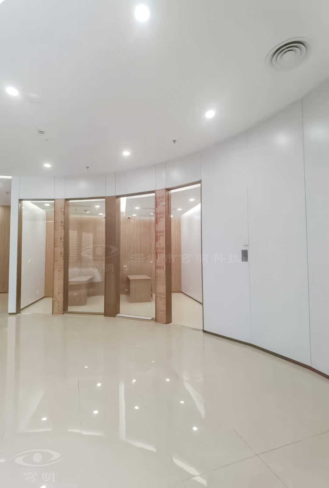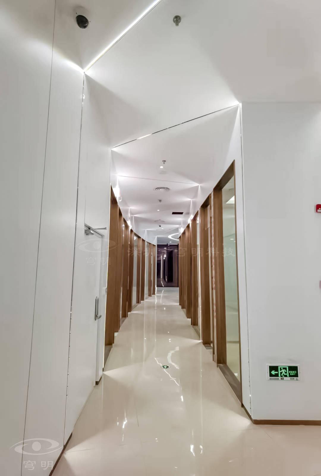 行政走廊以鏡面、陶瓷地板與sy849白色、紅豆杉木紋金屬復合板的碰撞融合,玻璃構成空間的多維度,使觀者置身其中,產(chǎn)生時尚簡約的共鳴。