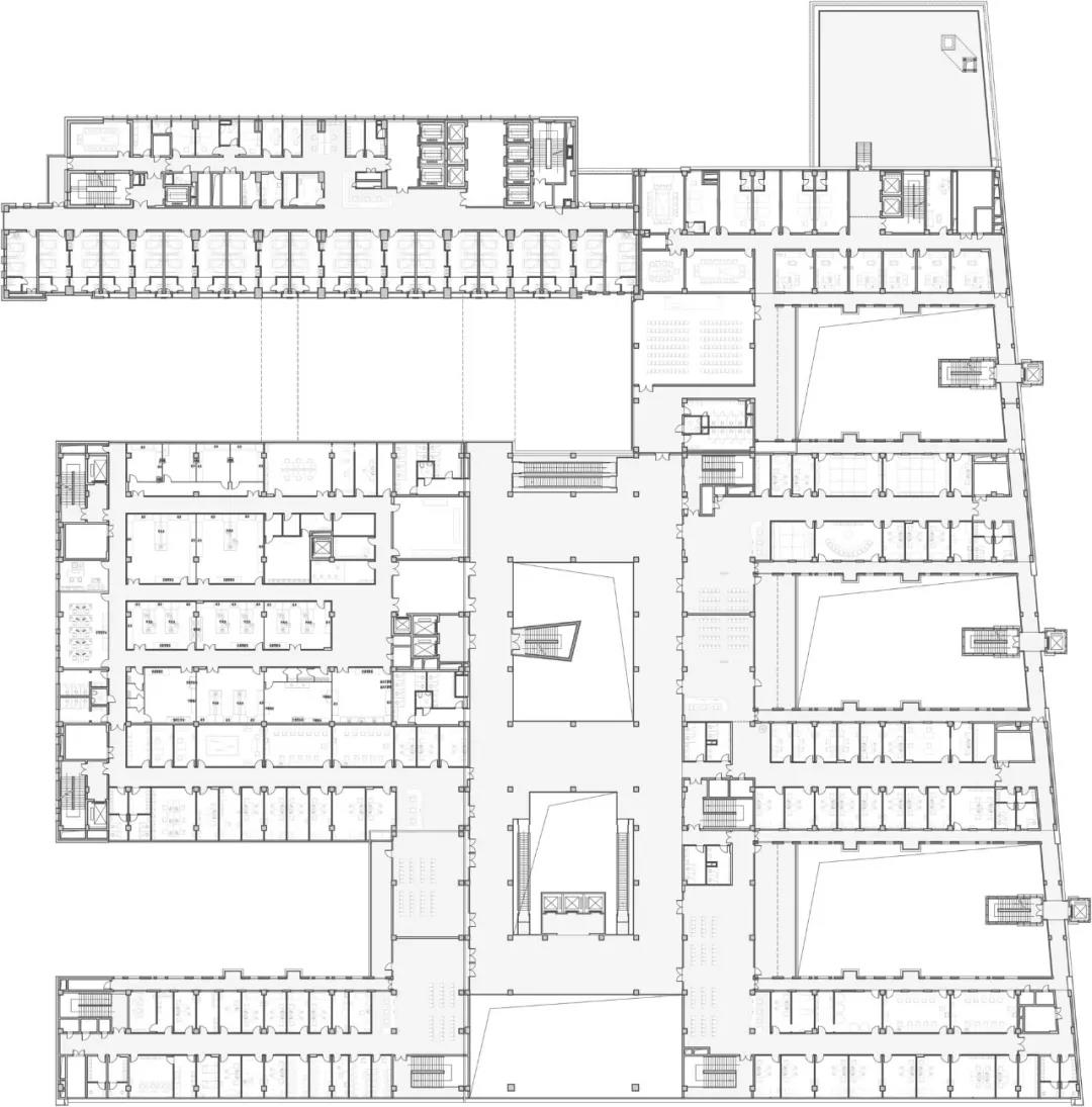 CAPOL負責進行從方案到施工圖全過程的建筑設計總承包工作,創造性地采用“緊湊型三角形結構”:以醫療技術部門為核心,門診部將布置在人流較多的城市主干道,住院部是遠離城市主干道和噪音源的。三角形布局形成的最短會診、急救流線和分層掛號系統,創造出了高效的就醫體驗。