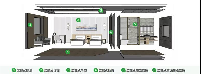 裝配式內裝整體解決方案提供了:裝配式隔墻系統、墻飾面系統、吊頂系統、地面系統、衛浴系統。